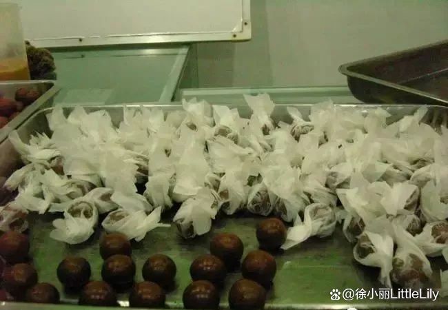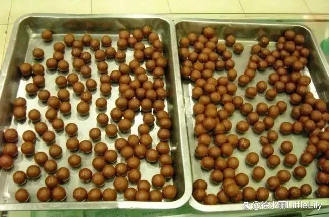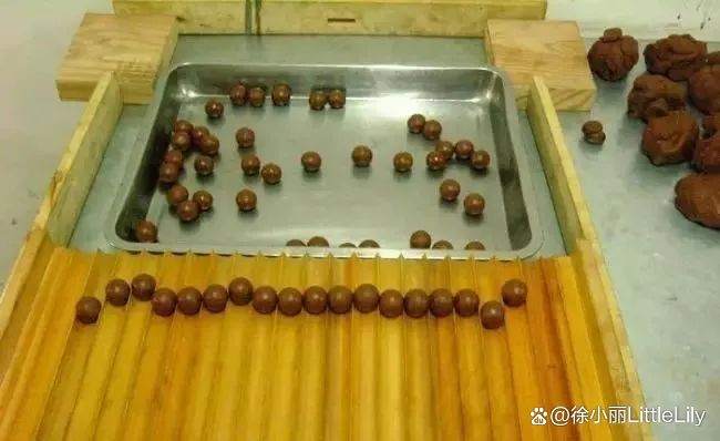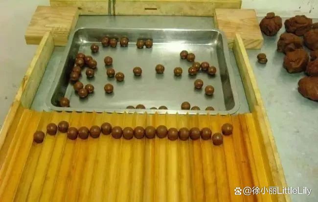 5、搓条与和丸:为避免药团粘手或粘器具,搓条与和丸时可用少量甘油、芝麻油或花生油等点于掌心进行,这样不仅不易沾粘,还能使丸药圆滑光亮。如按每粒丸药重10g计算,一料共重3000g,就要做成300粒。可将和好的药团分为三坨,每坨再分为5小坨,每小坨搓条后,切为20节,每节搓一丸即可,余皆准此。
