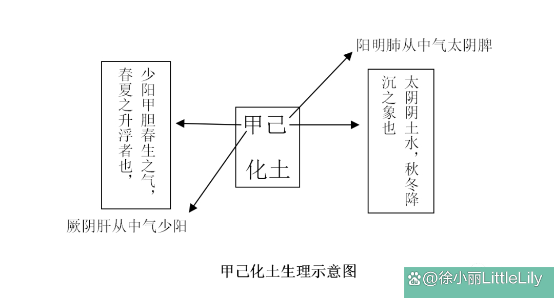 一是“甲己化土, 此仲景妙法也”。知道李东垣的医学思想来源于《内经》和张仲景。《内外伤辨惑论·临病制方》说:“易水张先生(张元素)云:仲景药为万世法,号群方之祖,治杂病若神,后之医家,宗《内经》法,学仲景心,可以为师矣!”所以李东垣必以《内经》、仲景为师,此旨贯穿李东垣全部医学著作中。甲己乃五运六气理论之土运。甲主少阳相火,己主太阴脾土,所谓“甲己化土”,乃少阳三焦相火生太阴脾土也,乃黄庭太极也。