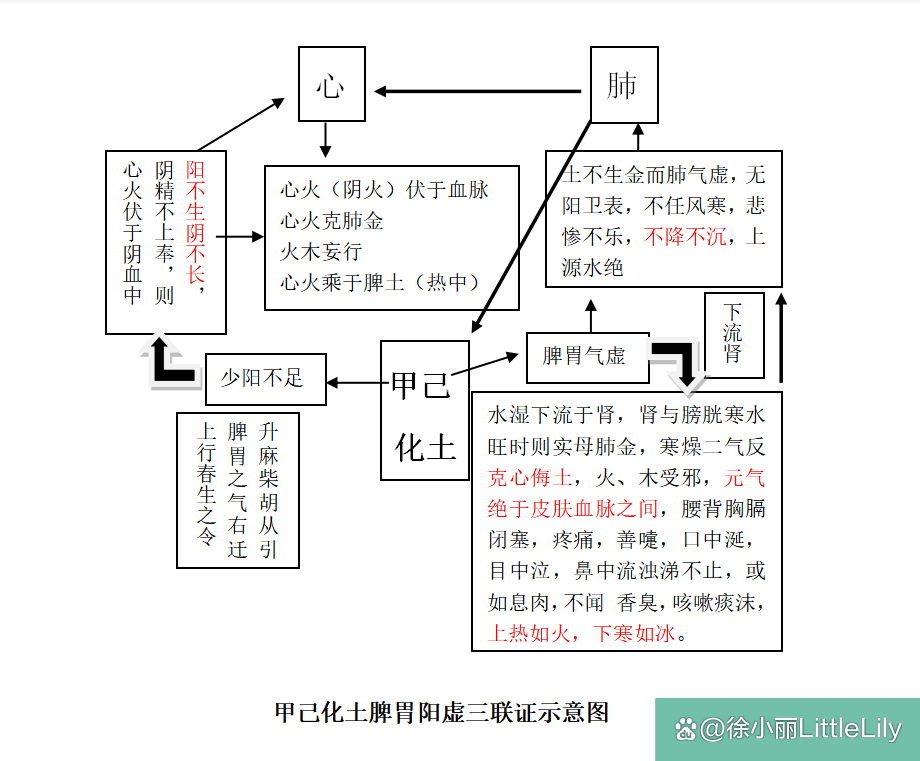 李东垣在《医学发明》“病有逆从,治有反正论”中说:“坤元一正之土,虽主生长,阴静阳躁,禀乎少阳元气乃能生育也。”故赵献可在《医贯》中曾说:“若夫土者,随火寄生,即当随火而补。……太阴脾土,随少阳相火而生,故补脾土者,补相火。”“人身脾土中火(田按:当是乘脾之心火),以甘温养其火,而火自退。《经》曰:‘劳者温之,损者温之。’甘能除大热,温能除大热,此之谓也。”但赵献可心火生胃土之说不可取,以李东垣之说为正。此说导致了阳虚三联证。