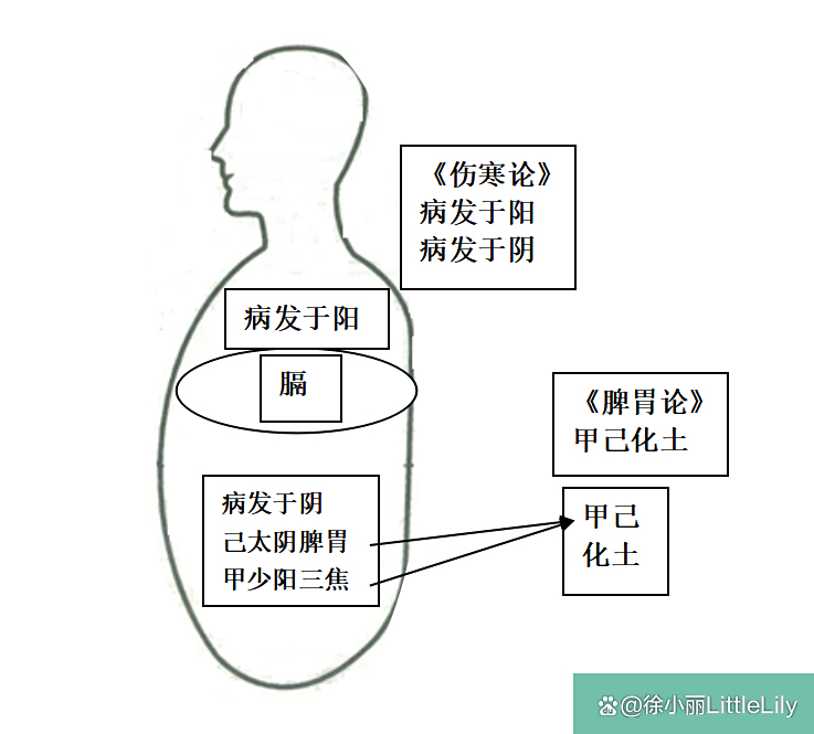 李东垣在《医学发明》“病有逆从,治有反正论”中说:“坤元一正之土,虽主生长,阴静阳躁,禀乎少阳元气乃能生育也。” 李东垣在《东垣试效方·妇人门》在《每日水泻三两行,米谷有时不化论》中说:“中有疾,傍取之。傍者,少阳甲胆是也;中者,脾胃也。脾胃有疾,取之于足少阳。甲胆者,甲风是也,东方风也。”所以脾胃病,必须突出少阳三焦相火的主宰地位。故《素问·阴阳别论》说:“所谓阳者,胃脘之阳也”。脾胃主四肢,故《素问·阴阳应象大论》说:“清阳出上窍……清阳发腠理……清阳实四肢。”所以泽田健先生在《针灸针髓》一书中治一切病都用少阳三焦原穴阳池和胃募穴中脘。