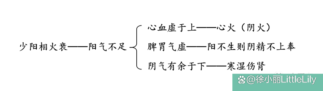 李东垣用非常简练的语言论述了脾胃虚弱的病因是“阳气不足”,其病机是“阳气不能生长,是春夏之令不行”。阳虚则阴盛,故云“阴气有余”。李东垣说:“脾病则下流乘肾,土克水,则骨乏无力,是为骨蚀,令人骨髓空虚,足不能履地,是阴气重叠,此阴盛阳虚之证 。”此指水湿下流于肾,故太阴脾胃病最多少阴肾病,而多用四逆汤。由于少阳三焦相火衰弱,不能腐熟水谷生化气血,故云“皆为血病”,即血虚之病也。血虚不能涵养心火,于是发生心火——阴火病。