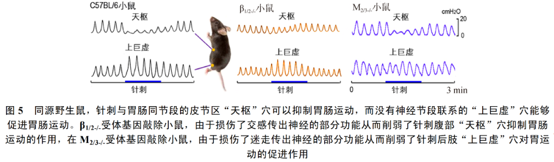 进一步采用敲除交感神经肾上腺素能β1/2受体和敲除副交感神经胆碱能M2/3受体基因的小鼠,观察针刺不同穴位对胃肠运动调节作用的影响。结果提示,β1/2-/-受体敲除后,腹部的单元穴位(“天枢”)对胃肠运动的抑制效应明显减弱,而后肢的集元穴位(“上巨虚”)促进胃肠运动的效应未发生明显改变;M2/3-/-受体敲除后,同节段的腹部穴位对胃肠运动的抑制效应不受影响,而异节段的后肢穴位促进胃肠运动的效应明显减弱[19]。这些结果表明β1/2受体是构成针刺与胃肠支配同节段的单元穴位发挥抑制胃肠运动的重要环节,而M2/3受体是构成针刺与胃肠支配异节段的集元穴位对胃肠运动起促进效应的神经通路(图5)。