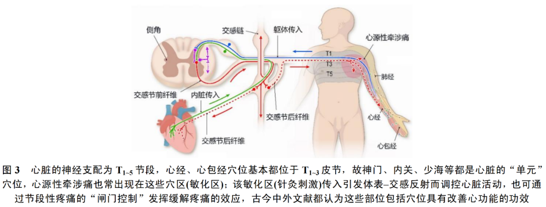 这些从古至今的临床观察和诊治案例如此相同必然蕴含着共同的生物医学原理。靶器官(这里指心脏)与相关穴位(可能包括经脉的一段)节段性神经传入会引发3种效应:①靶器官的病理反应通过内脏传入(也可以是躯体深部软组织病理性传入)牵涉性诱发体表相应节段的皮节区发生牵涉性感觉异变(如牵涉痛现象),这种反应具有疾病“警示”的诊断作用,并继发性触发病变“自我修复”的级联反应;②同节段外周传入(包括体表穴位的和内脏的)在相应的脊髓节段会发生相互作用而产生镇痛效应(痛的闸门控制[15]),可以缓解靶器官疼痛;③相应体表的自发传入(如采用人为干预刺激可以进一步加强)通过躯体-交感反射性联系,发挥对内脏活动的调控功能[16],起到对靶器官病变的修复和治疗作用(图3)。