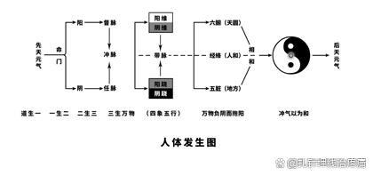 中国传统文化认为天人相应,因而人体的发生和天地万物的发生遵循一致的规律。《道德经》阐述了天地万物的发生过程,即“道生一,一生二,二生三,三生万物,万物负阴而抱阳,冲气以为和”,人体的发生也遵循了这个过程。