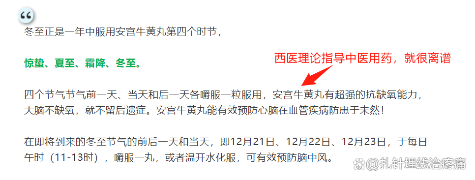 这些所谓的“中医科普”大肆宣传冬至、夏至要吃安宫牛黄丸,可以扩张血管,降低血压,预防中风或者脑梗,有若干好处等等等等。